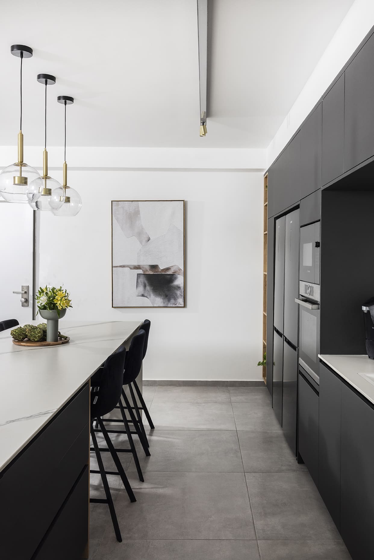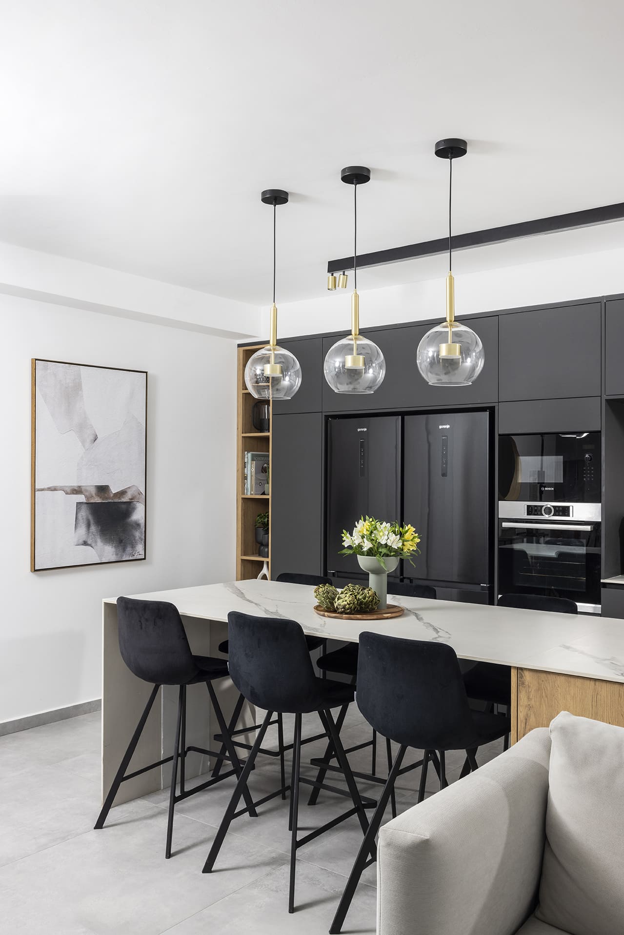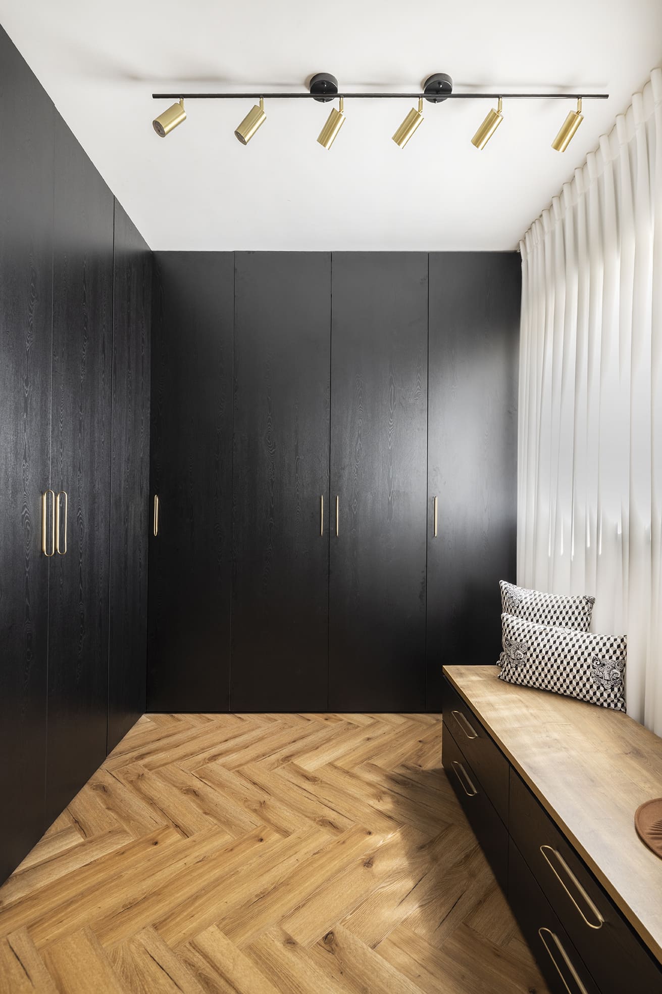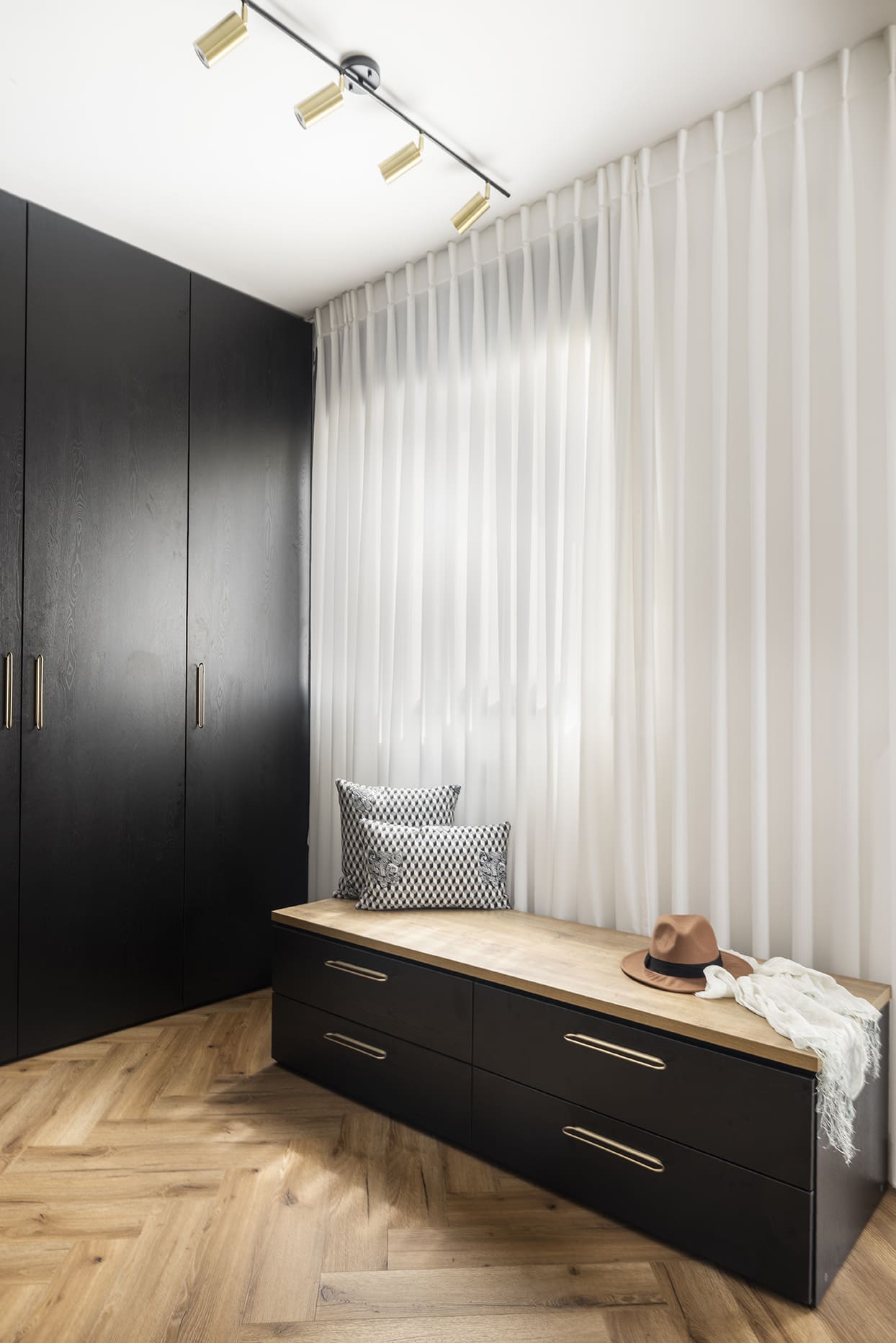 קיבלנו שפע של אחסון וניצול מקסימלי של חלל המסדרון הארוך שהיה נתון בתכנון הקבלני.בתכנון המטבח שתופס חלק מרכזי בבית ירדנו לפרטים הקטנים: תכנון אחסון רב, משטחי עבודה גדולים, תאורה טכנית לעבודה נוחה ואווירה, נוחות בישיבה, מדפים פתוחים לנוי, בחירת חומרי גמר שמשתלבים עם כל הקונספט העיצובי – קונטרסט מודרני בין שחור ללבן בשילוב עץ וגוונים חמים.חדר השינה של ההורים תוכנן מחדש כסוויטת הורים מפנקת ומרווחת באיחוד שני חדרים יחד.