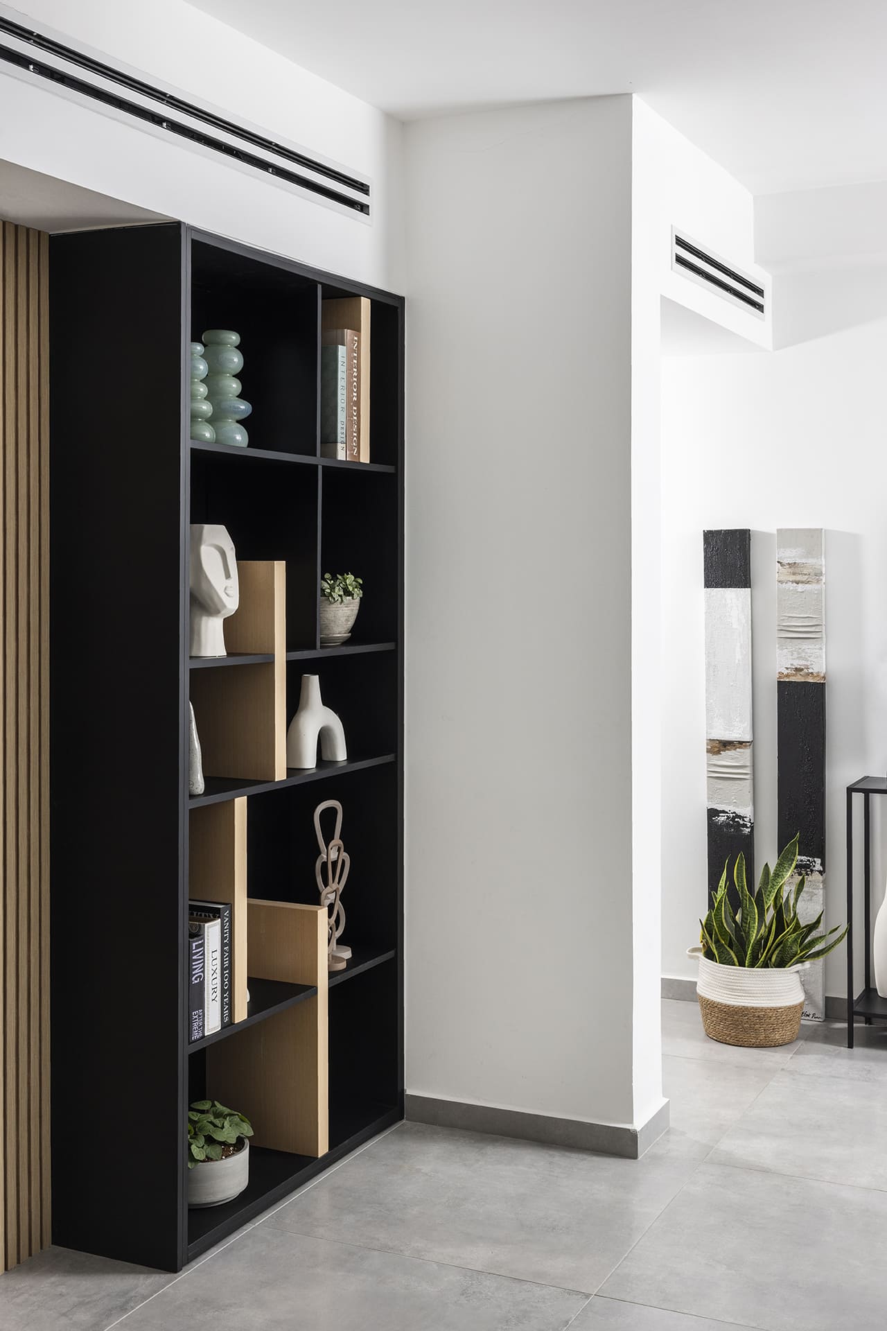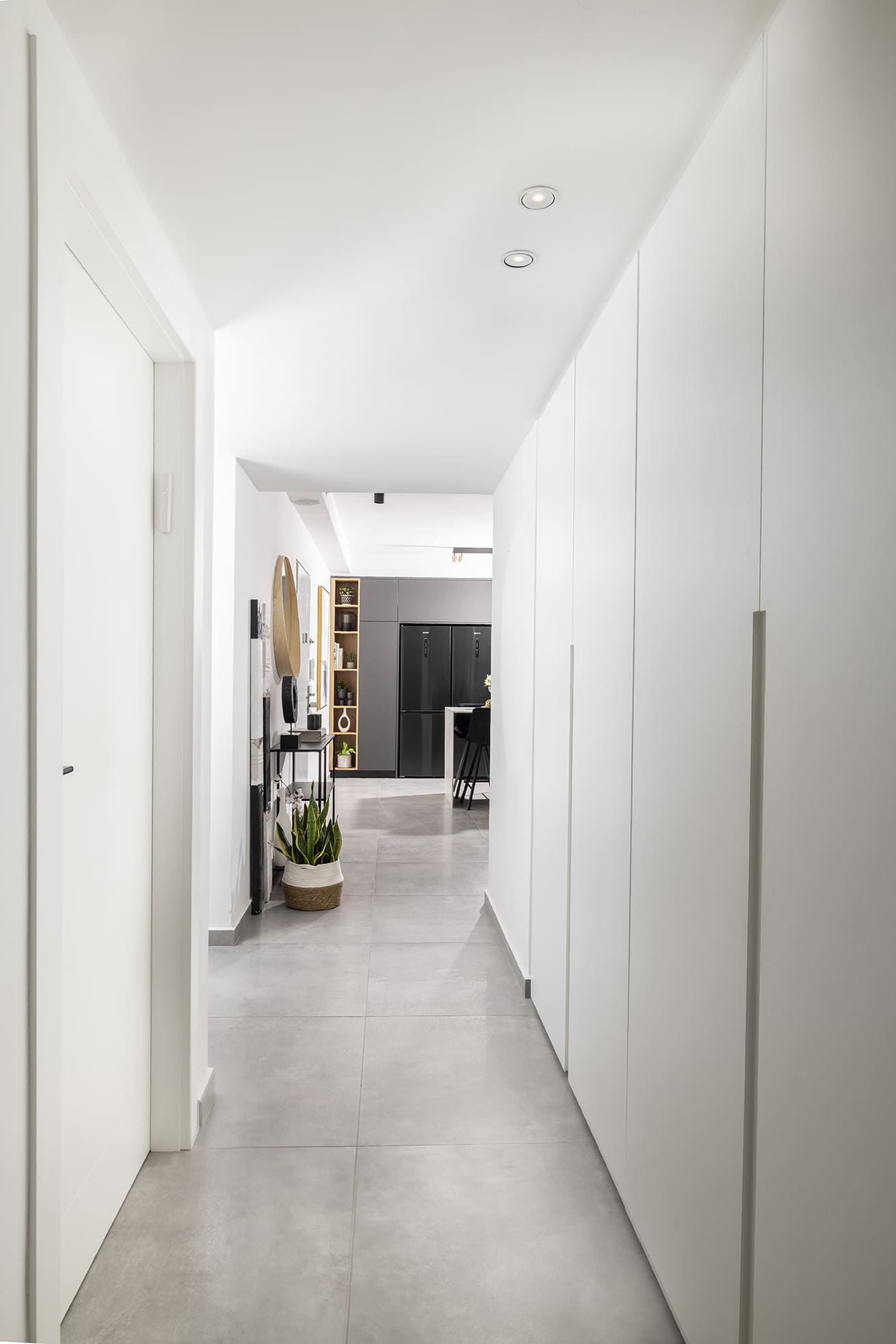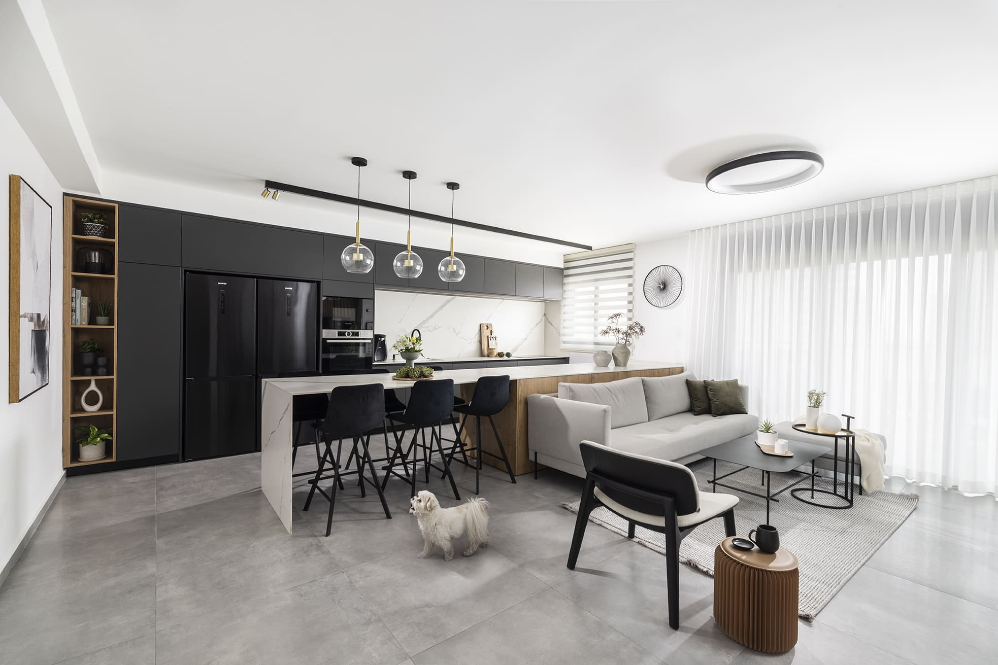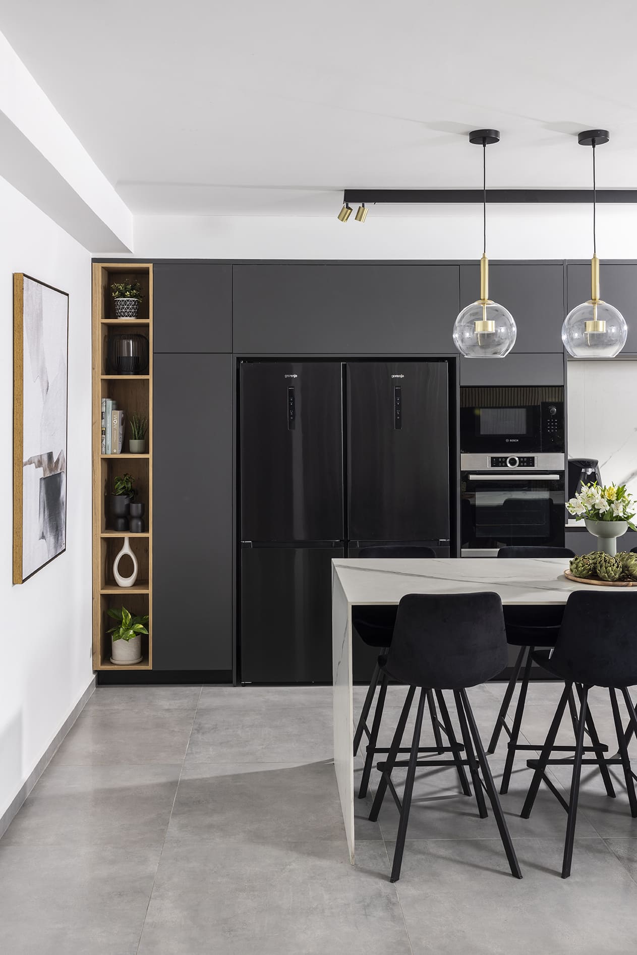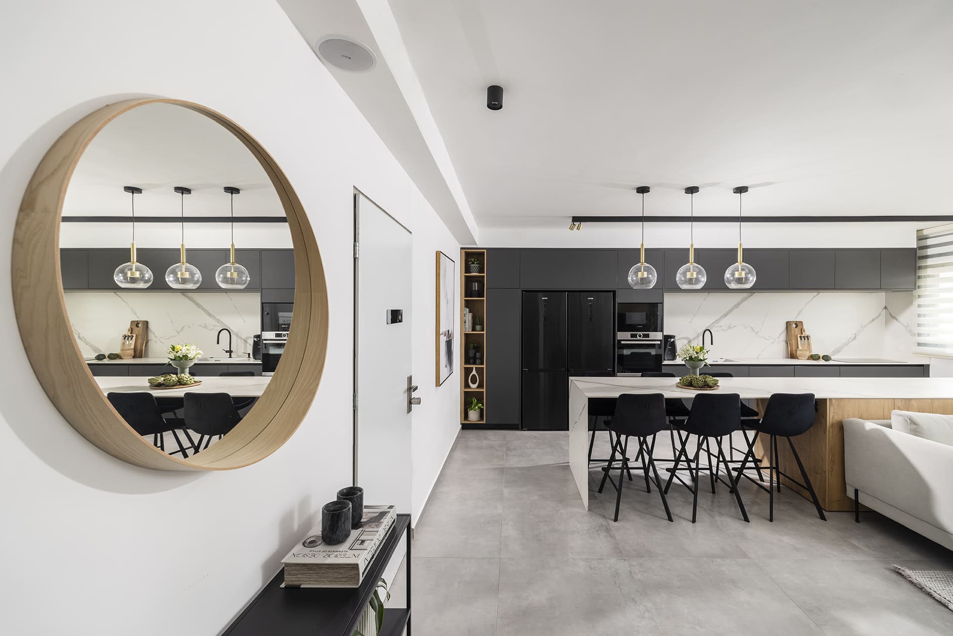 קיבלנו שפע של אחסון וניצול מקסימלי של חלל המסדרון הארוך שהיה נתון בתכנון הקבלני.בתכנון המטבח שתופס חלק מרכזי בבית ירדנו לפרטים הקטנים: תכנון אחסון רב, משטחי עבודה גדולים, תאורה טכנית לעבודה נוחה ואווירה, נוחות בישיבה, מדפים פתוחים לנוי, בחירת חומרי גמר שמשתלבים עם כל הקונספט העיצובי – קונטרסט מודרני בין שחור ללבן בשילוב עץ וגוונים חמים.חדר השינה של ההורים תוכנן מחדש כסוויטת הורים מפנקת ומרווחת באיחוד שני חדרים יחד.