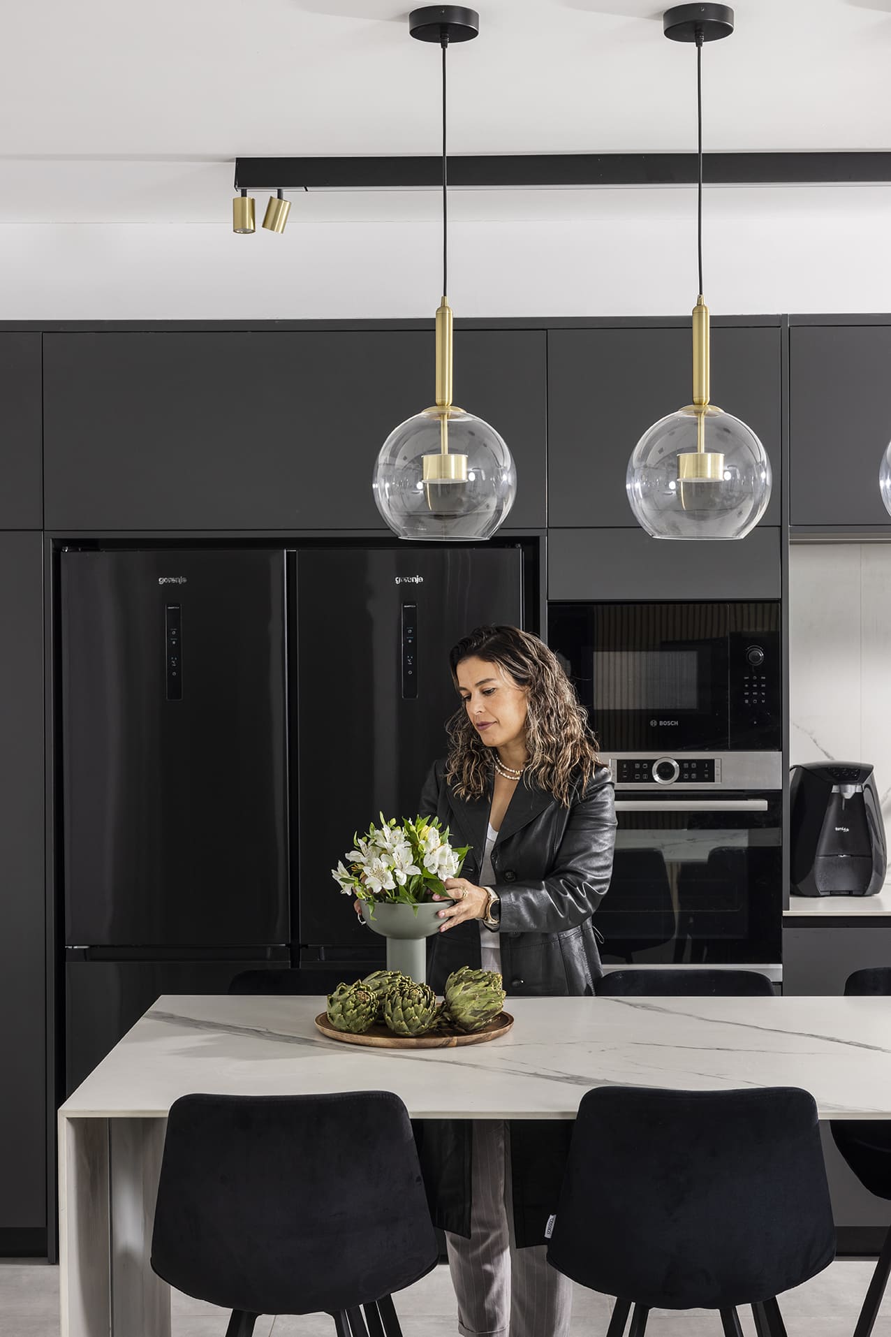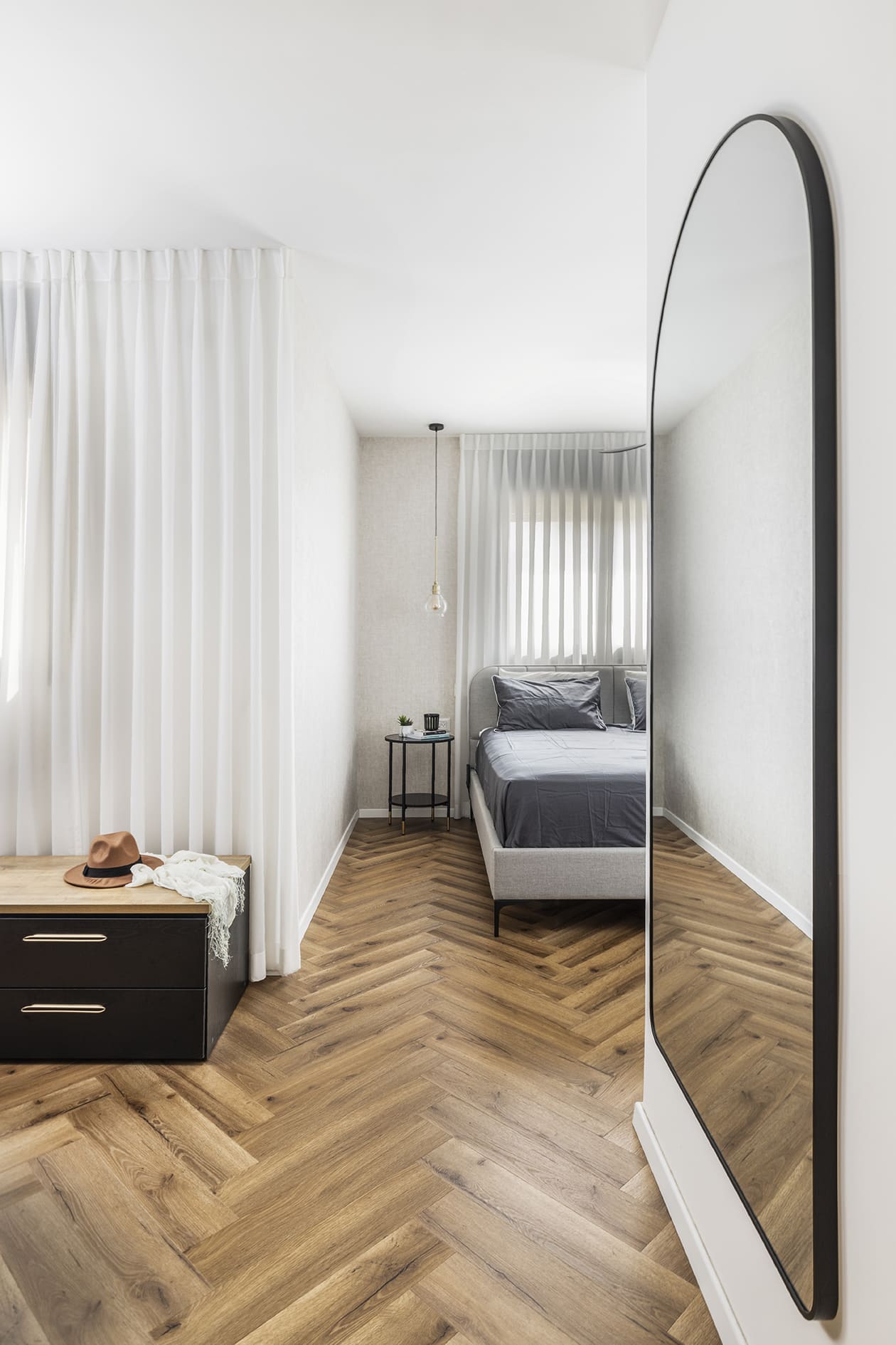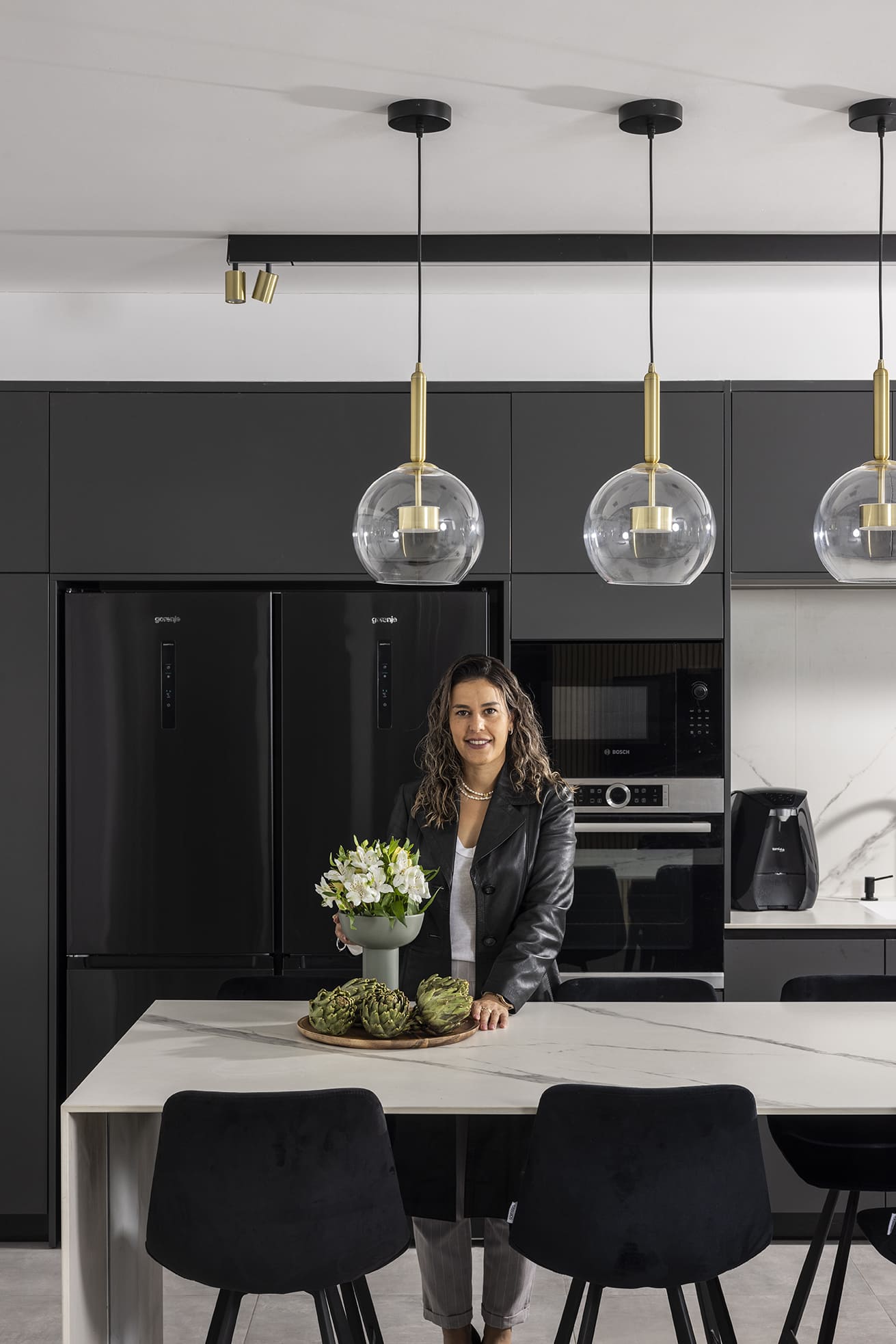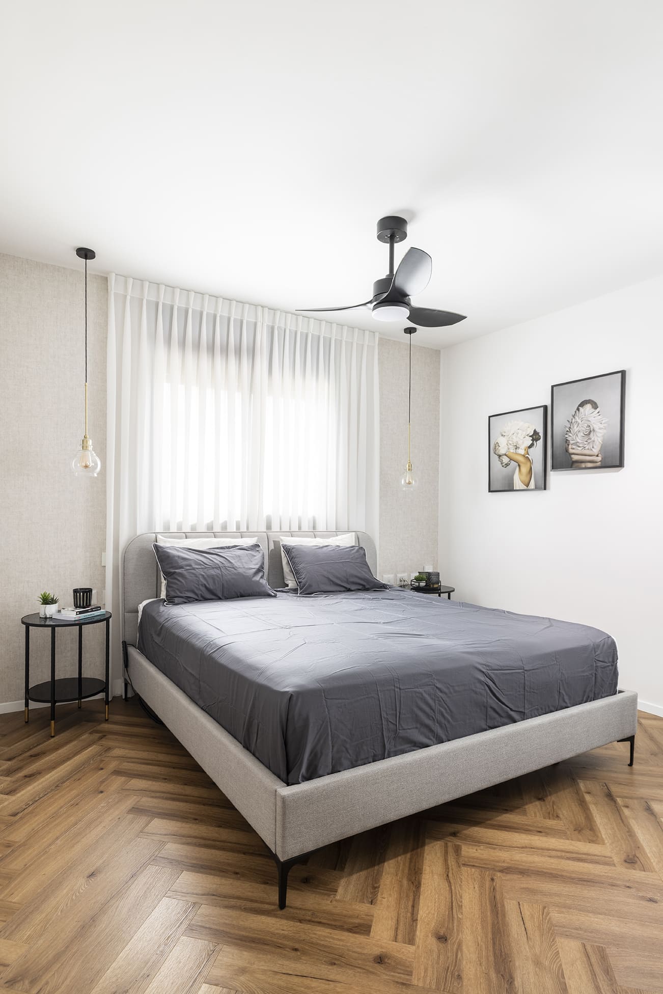קיבלנו שפע של אחסון וניצול מקסימלי של חלל המסדרון הארוך שהיה נתון בתכנון הקבלני.בתכנון המטבח שתופס חלק מרכזי בבית ירדנו לפרטים הקטנים: תכנון אחסון רב, משטחי עבודה גדולים, תאורה טכנית לעבודה נוחה ואווירה, נוחות בישיבה, מדפים פתוחים לנוי, בחירת חומרי גמר שמשתלבים עם כל הקונספט העיצובי – קונטרסט מודרני בין שחור ללבן בשילוב עץ וגוונים חמים.חדר השינה של ההורים תוכנן מחדש כסוויטת הורים מפנקת ומרווחת באיחוד שני חדרים יחד.