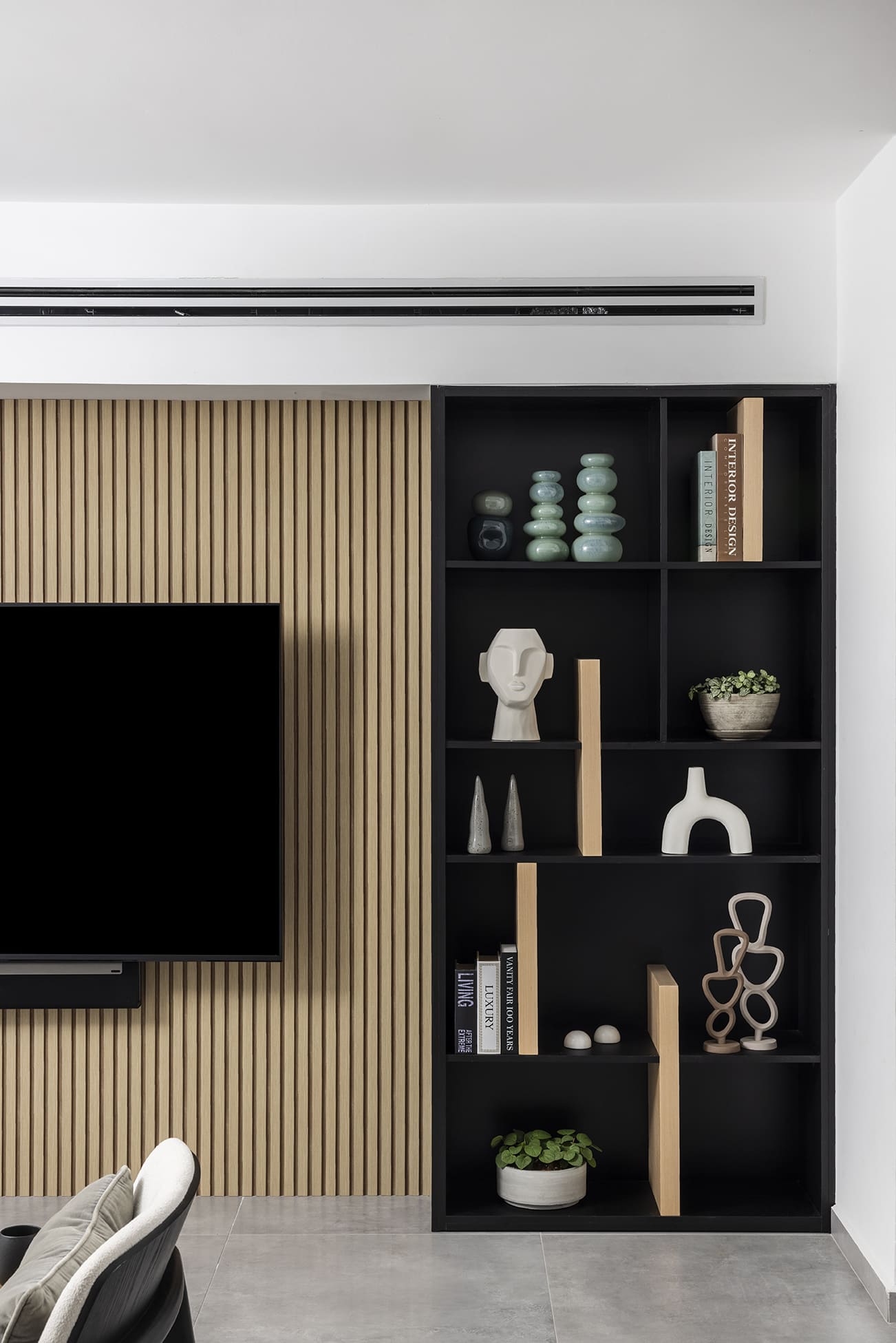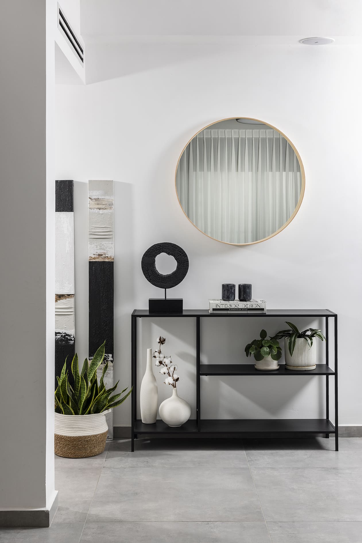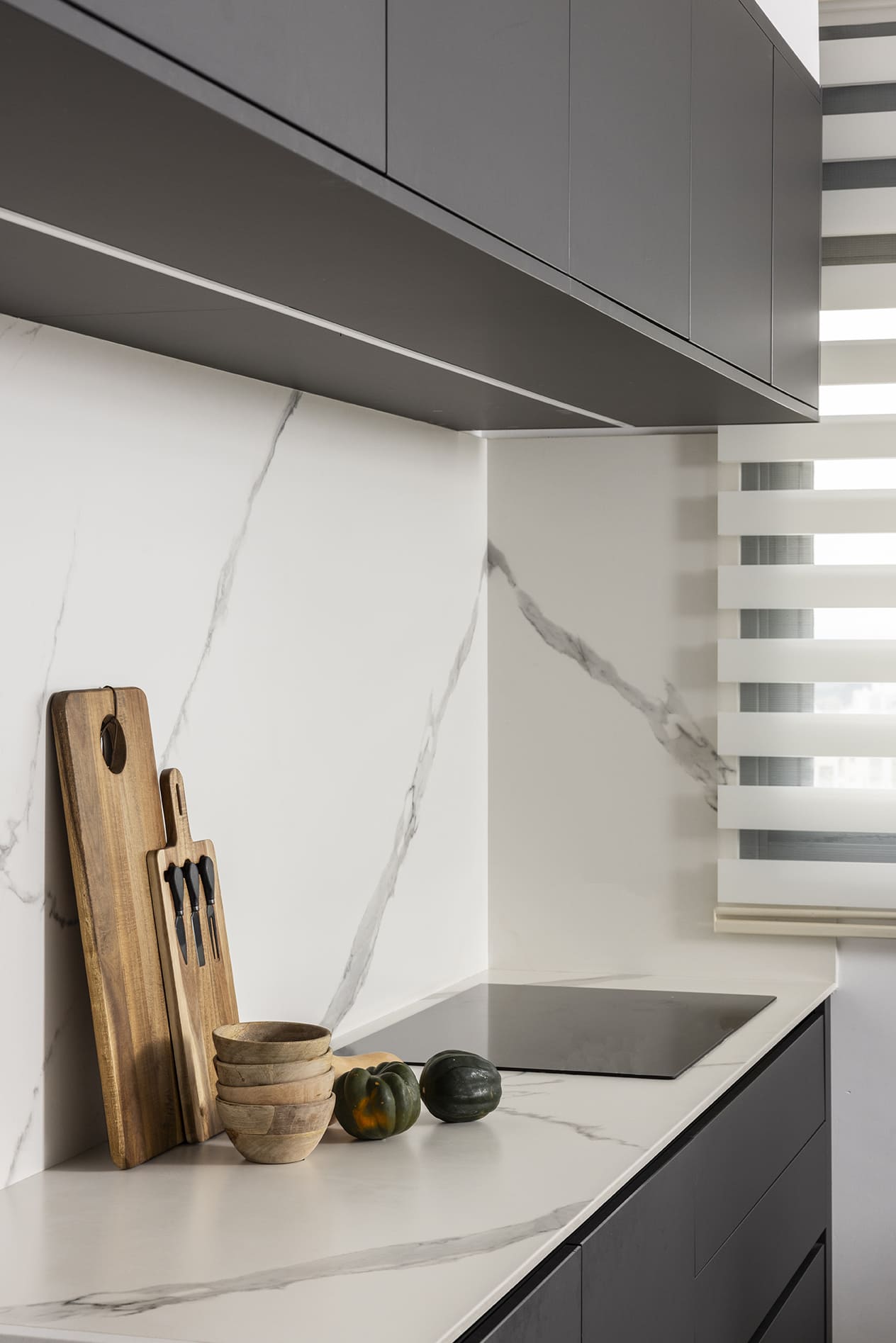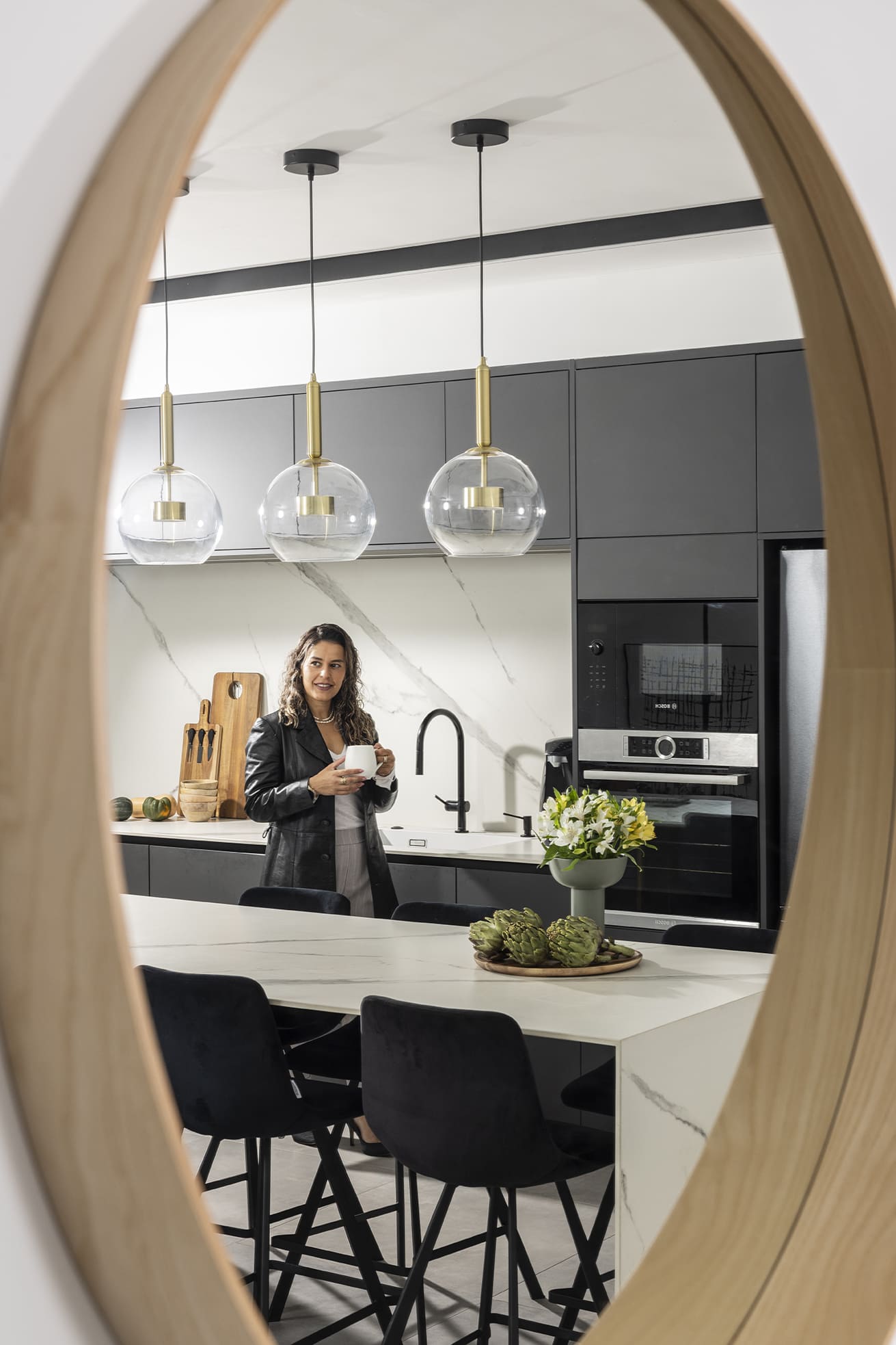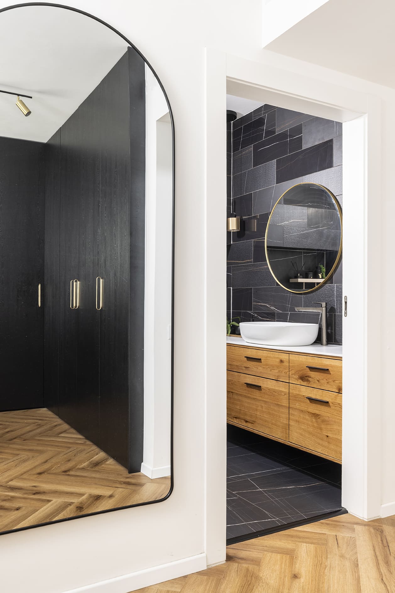 קיבלנו שפע של אחסון וניצול מקסימלי של חלל המסדרון הארוך שהיה נתון בתכנון הקבלני.בתכנון המטבח שתופס חלק מרכזי בבית ירדנו לפרטים הקטנים: תכנון אחסון רב, משטחי עבודה גדולים, תאורה טכנית לעבודה נוחה ואווירה, נוחות בישיבה, מדפים פתוחים לנוי, בחירת חומרי גמר שמשתלבים עם כל הקונספט העיצובי – קונטרסט מודרני בין שחור ללבן בשילוב עץ וגוונים חמים.חדר השינה של ההורים תוכנן מחדש כסוויטת הורים מפנקת ומרווחת באיחוד שני חדרים יחד.