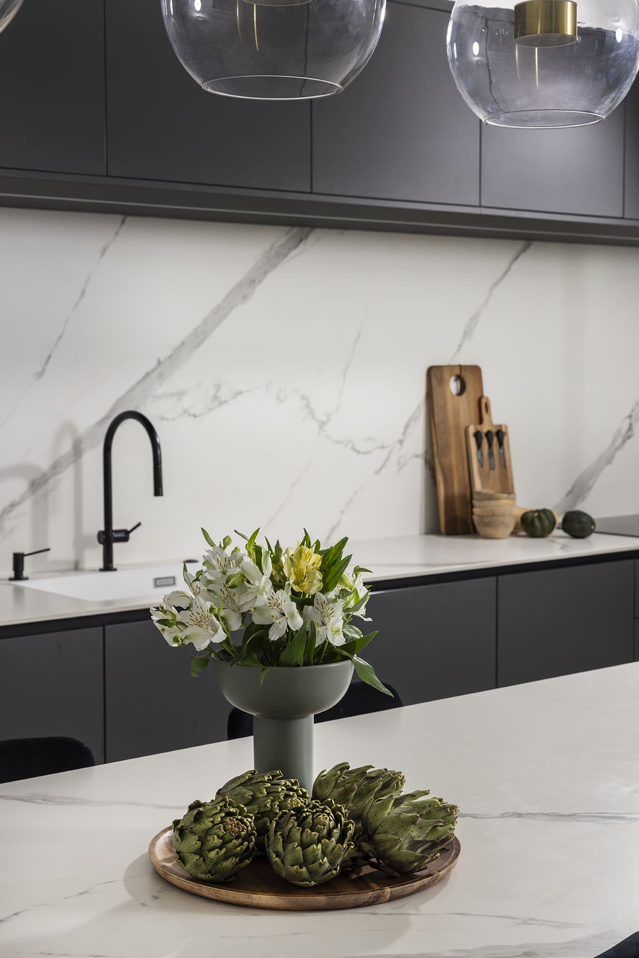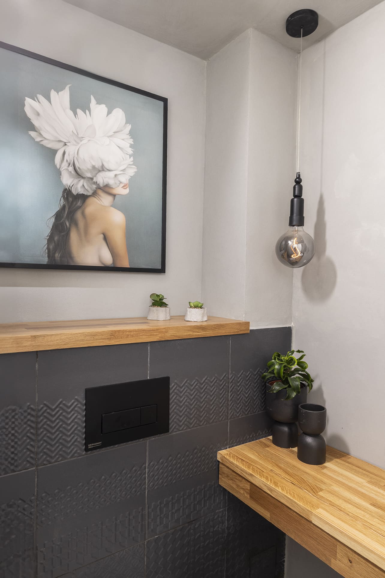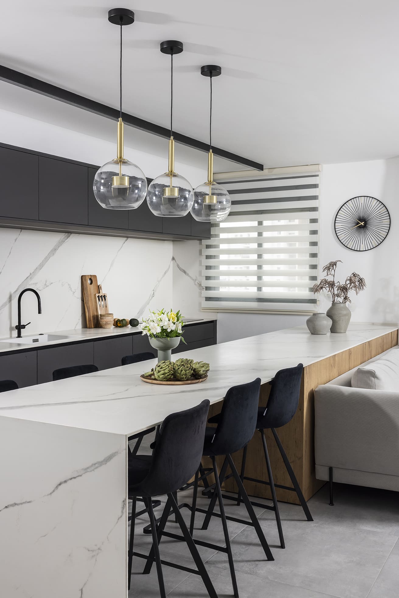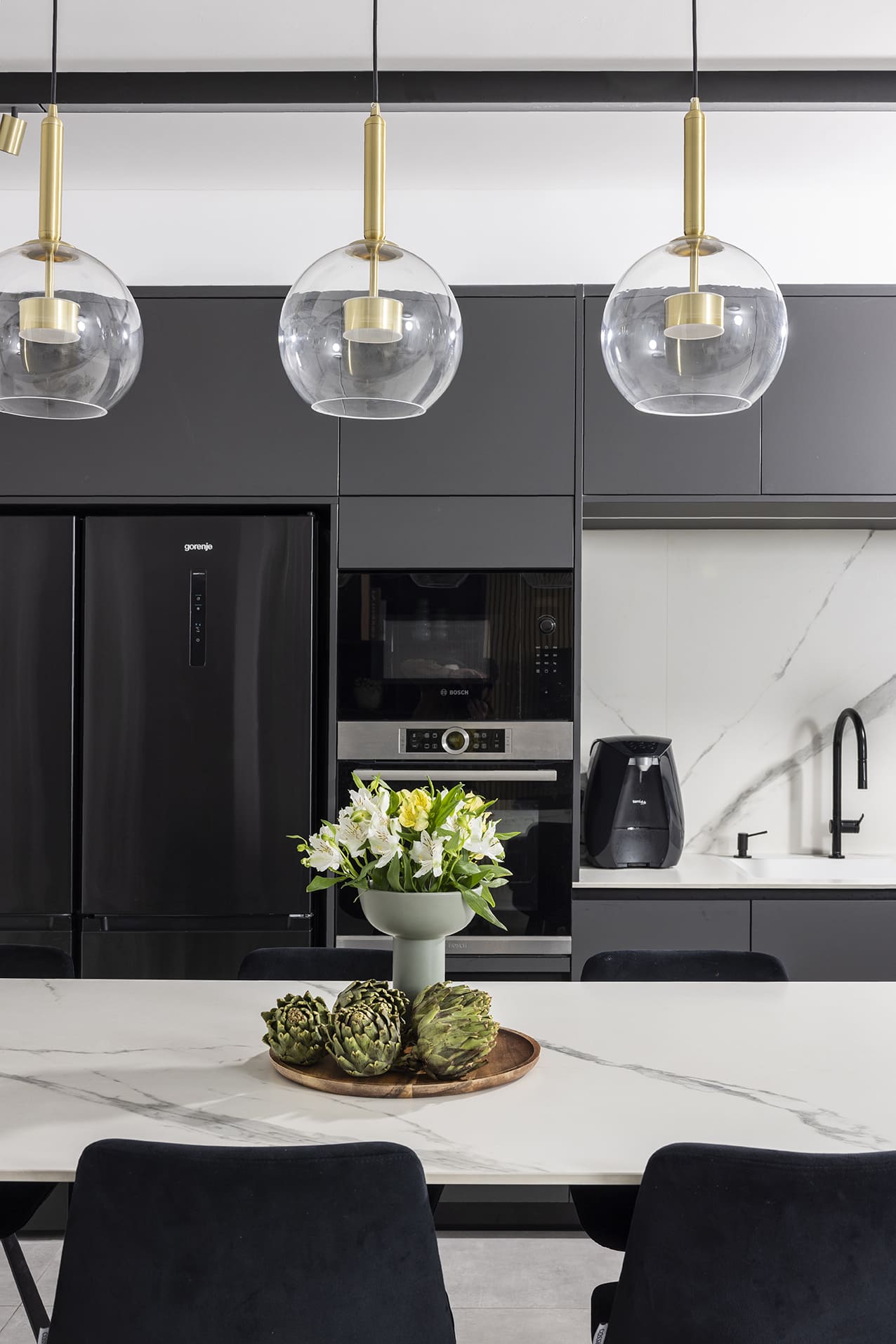 קיבלנו שפע של אחסון וניצול מקסימלי של חלל המסדרון הארוך שהיה נתון בתכנון הקבלני.בתכנון המטבח שתופס חלק מרכזי בבית ירדנו לפרטים הקטנים: תכנון אחסון רב, משטחי עבודה גדולים, תאורה טכנית לעבודה נוחה ואווירה, נוחות בישיבה, מדפים פתוחים לנוי, בחירת חומרי גמר שמשתלבים עם כל הקונספט העיצובי – קונטרסט מודרני בין שחור ללבן בשילוב עץ וגוונים חמים.חדר השינה של ההורים תוכנן מחדש כסוויטת הורים מפנקת ומרווחת באיחוד שני חדרים יחד.