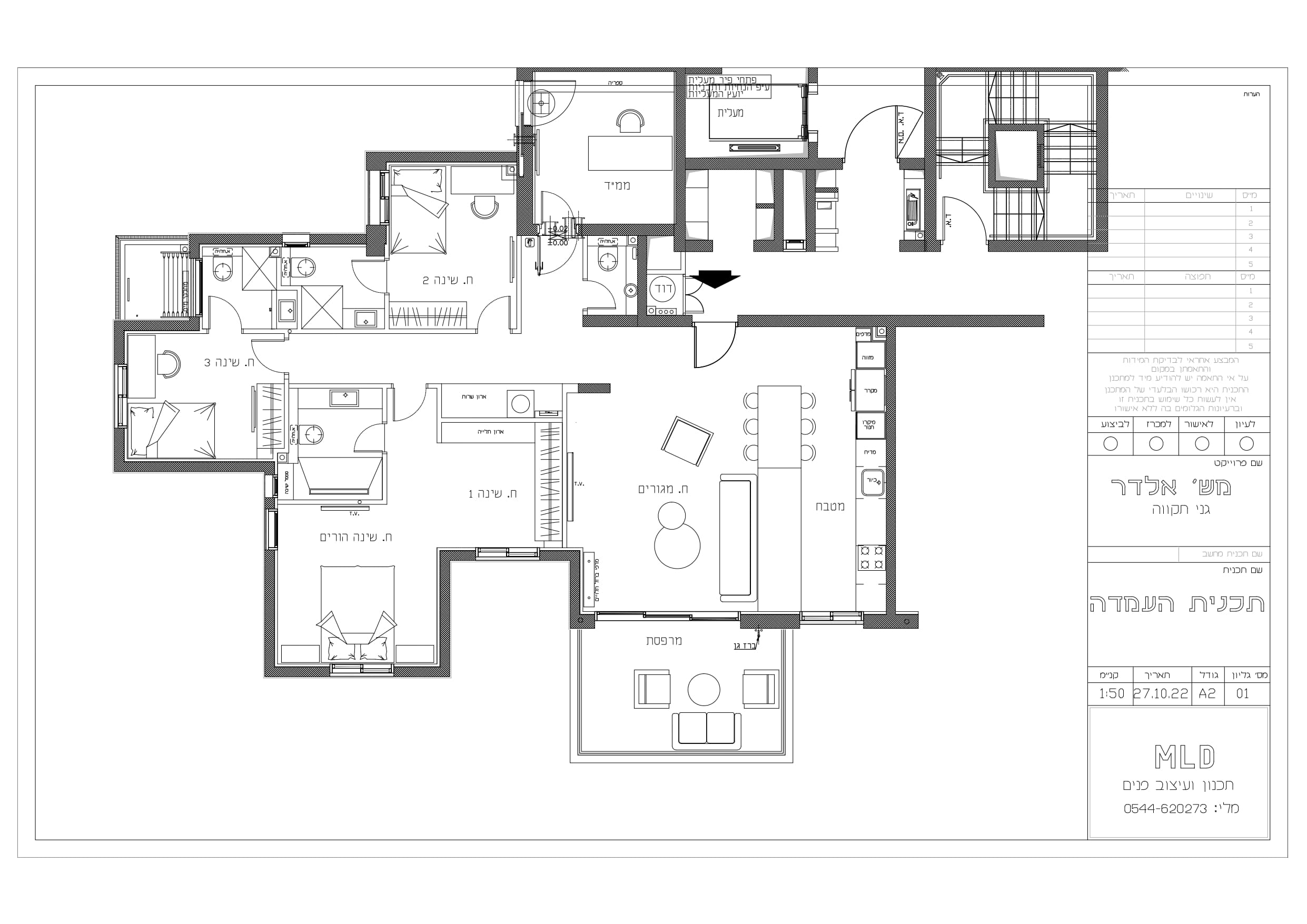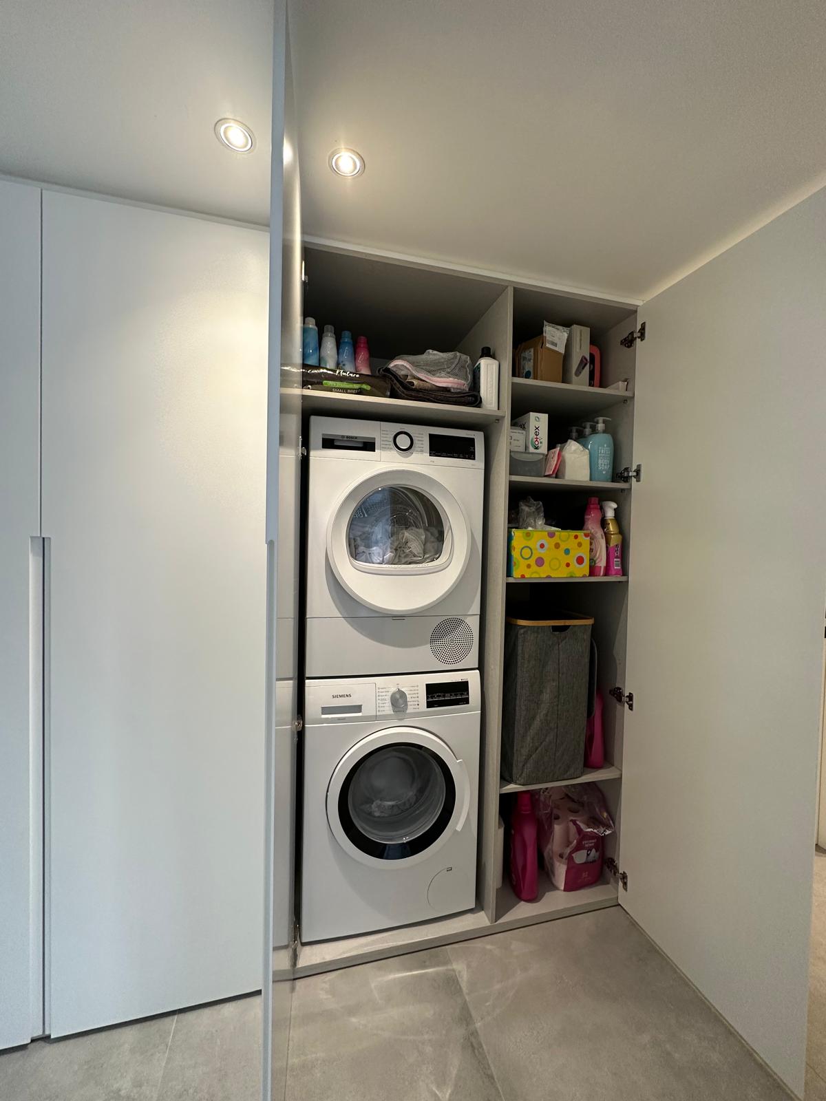 דירת 125 מ"ר שתוכננה מחדש לדירת 4 חדרים בהתאם לצרכי הלקוחות. הלקוחות חזרו אלי בפעם השנייה לתכנן ולעצב שוב את ביתם הפעם מדובר על דירת קבלן חדשה שצריך להתאים אותה לילדות שגדלו. התבקשתי לתכנן בשני חדרי השינה שלהן גם חדרי רחצה פרטיים.בתכנון החדש ויתרנו על חדר כביסה סגור והעברנו את אזור הכביסה למסדרון.